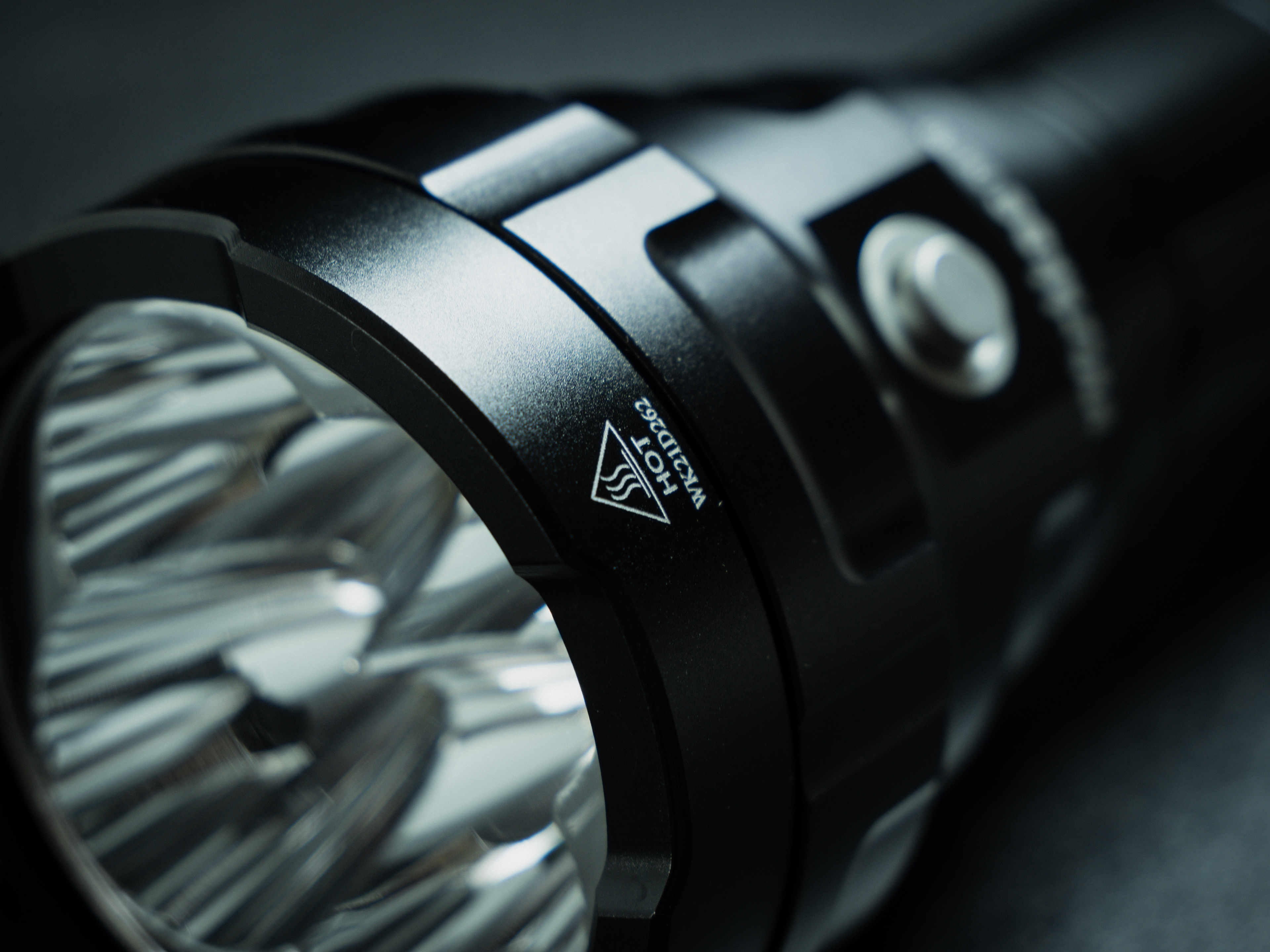 Very thick unscrewable aluminium bezel covering glass. As you can see there is a mark of "hot", but in facts after one minute on turbo it is still possible to hold it on bare hand. Really nice thermal mass on that one!
